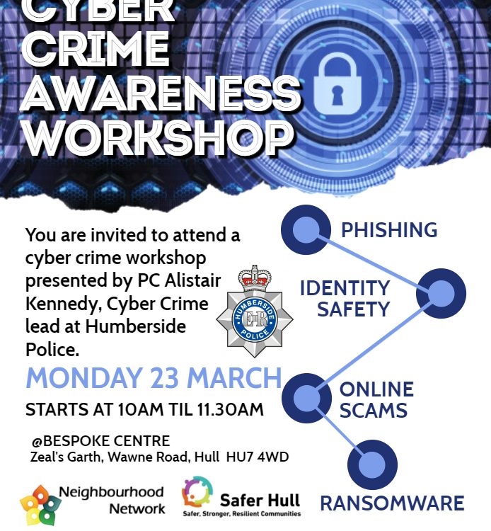17th February 2020 17th February 2020Categories AdviceEmployment and TrainingEvents & ActivitiesEvents PageNewsCyber Crime Awareness WorkshopWe are pleased to announce that the Neighbourhood Network will be hosting a Cyber Crime Awareness Workshop on […]