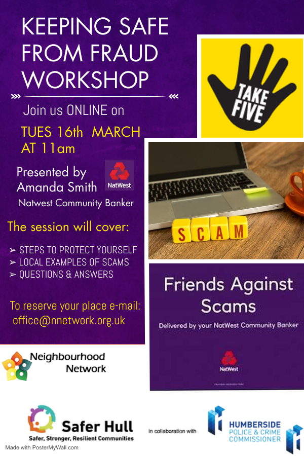 Join the Neighbourhood Network team on Tuesday 16th March at 11am along with Amanda Smith from NatWest for a presentation on how you can keep yourself safe from Fraud.