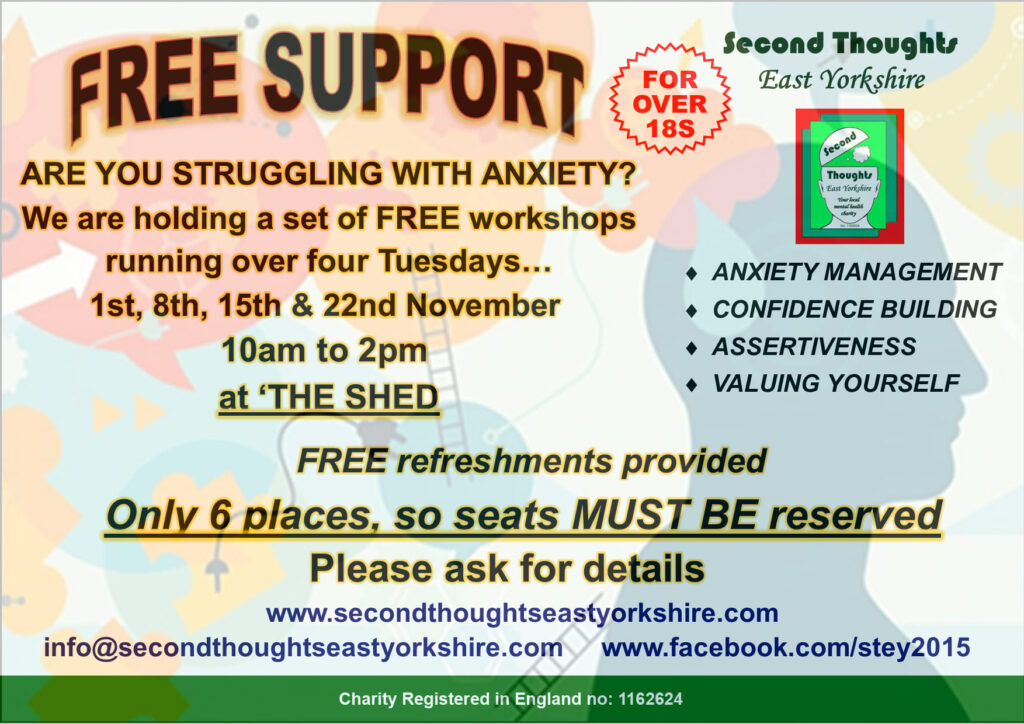 Groundwork Hull are working in partnership with Second Thoughts East Yorkshire. They will be running support sessions for people struggling with anxiety from The Shed at 108 West Dock Avenue Hull Hu3 4JR.