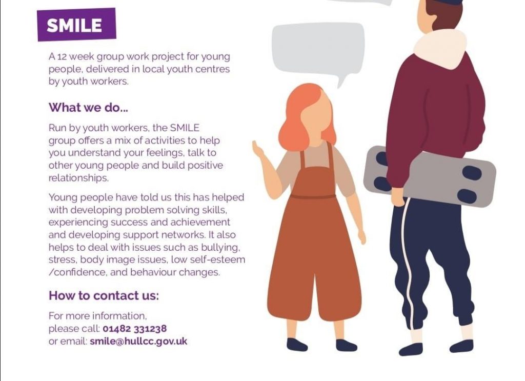 There is still time to enter Hull Libraries photo competition28th August 2020Hull: Plan for a new ‘aquagreen’ to reduce flooding in east Hull28th August 2020Astra Youth Centre shortly to launch Smile Project for 10-16 year olds 28th August 2020 Categories AdviceGet InvolvedNews Tags Astra Youth Centrechildrens support services in hullhullSmile Projectyouth services in Hull Astra Youth Centre will soon be reopening and launching their own Smile Project. Do you know anyone aged 10 to 16 who may need support with their confidence and self-esteem?Contact Astra Youth Centre on 01482 310925 for more informationShare