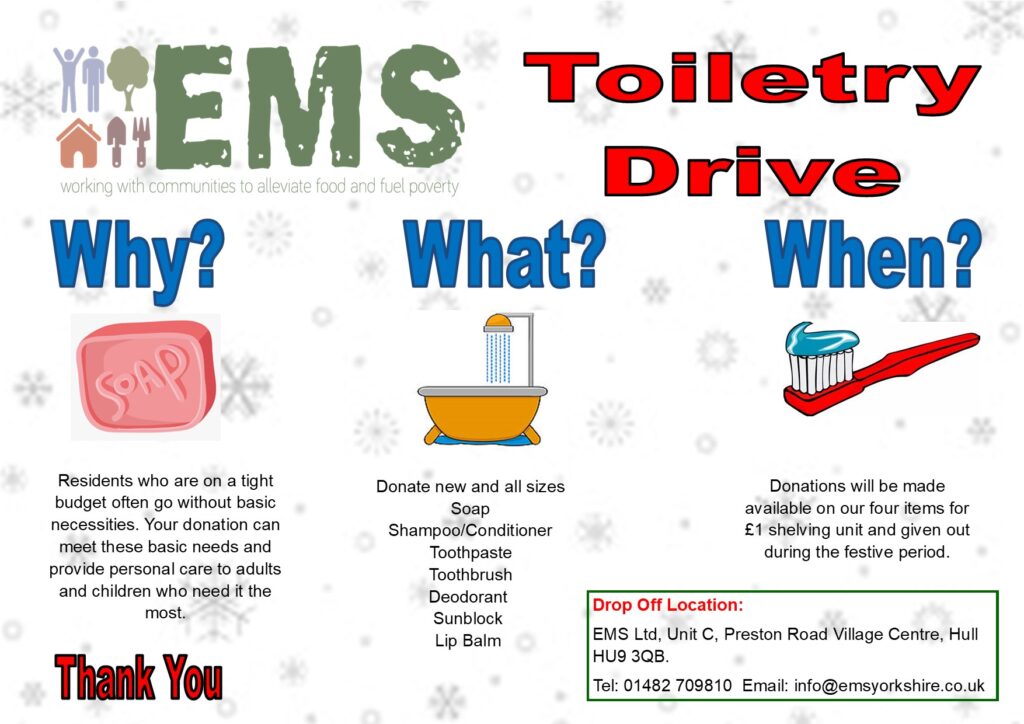 Items can be dropped off at the EMS office at The Freedom Centre or St. Aidan’s Church – all will be gratefully received.