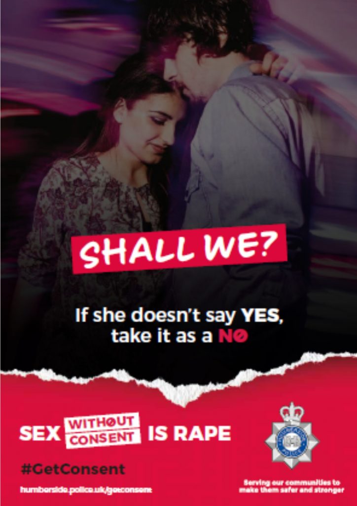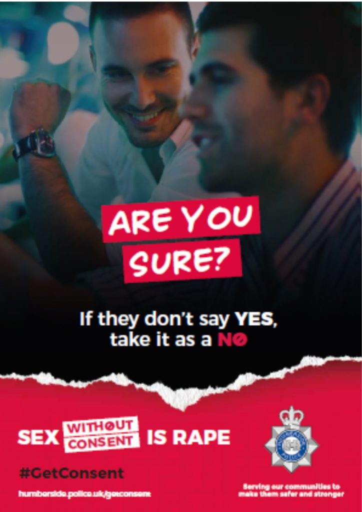 “This campaign is all about raising awareness of the issue of consent in the hope that we can prevent, reduce and stop offenders from targeting vulnerable people. #GetConsent is about exactly that – Just because you meet someone on a night out and you flirt, dance and kiss doesn’t mean that that person wants to take things any further or have sex. If they are drunk or have taken drugs means you may not be able to be confident that the person is fully happy with the situation or indeed able to consent to what is happening.