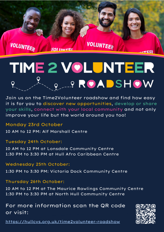 Time2Volunteer are hosting a roadshow here at the Alf Marshall Community Centre on Monday 23rd October starting at 10am. You will be able to find out more information on what volunteering opportunities are available across Hull and the surrounding areas and talk to people on the benefits of volunteering and ways on which it can help you to learn new skills, meet new people and benefit your community!