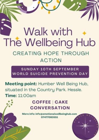 Are you free on Sunday 10th September? If yes, why not get out in the fresh air and join the Humber Wellbeing Hub team for a walk, coffee, cake & conversation.
