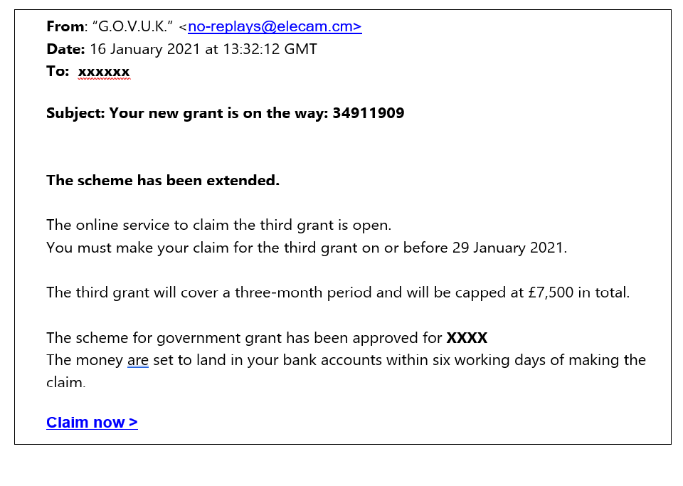 HMRC is aware of a phishing campaign telling customers they can claim ‘for the third grant’ as support during the coronavirus (COVID-19) pandemic.